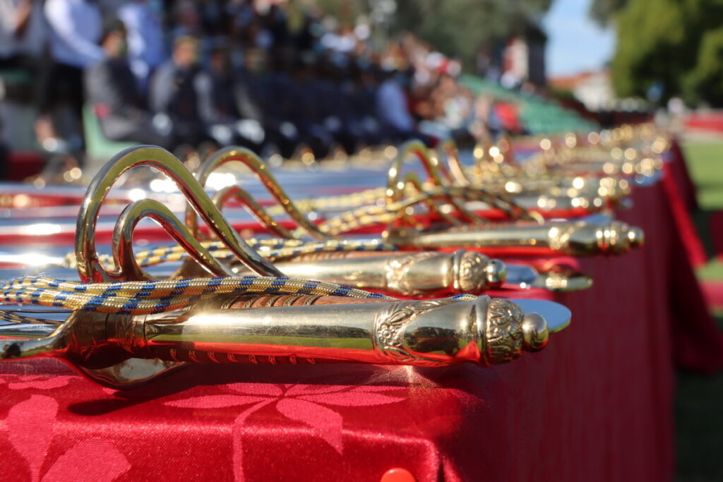 A espada representa não só a autoridade como também a vida militar. Como tal, é entregue, solenemente, como símbolo material da autoridade, que deve ser usada na aplicação dos mais legítimos princípios da honra cultivados e praticados ao longo da carreira. A espada simboliza e enaltece a aplicação dos princípios e valores caracterizadores do oficial, no uso da autoridade militar de que é investido, para cumprir e fazer cumprir os deveres e obrigações militares, dos quais se destacam a responsabilidade, a competência, a bondade, a lealdade, a aplicação da justiça, o respeito e o amor à Pátria e a tudo que a ela diz respeito. Caracteriza-se, portanto, não como um simbolismo puro, mas sim como um instrumento de exaltação do que existe de mais belo e puro na carreira do oficial.