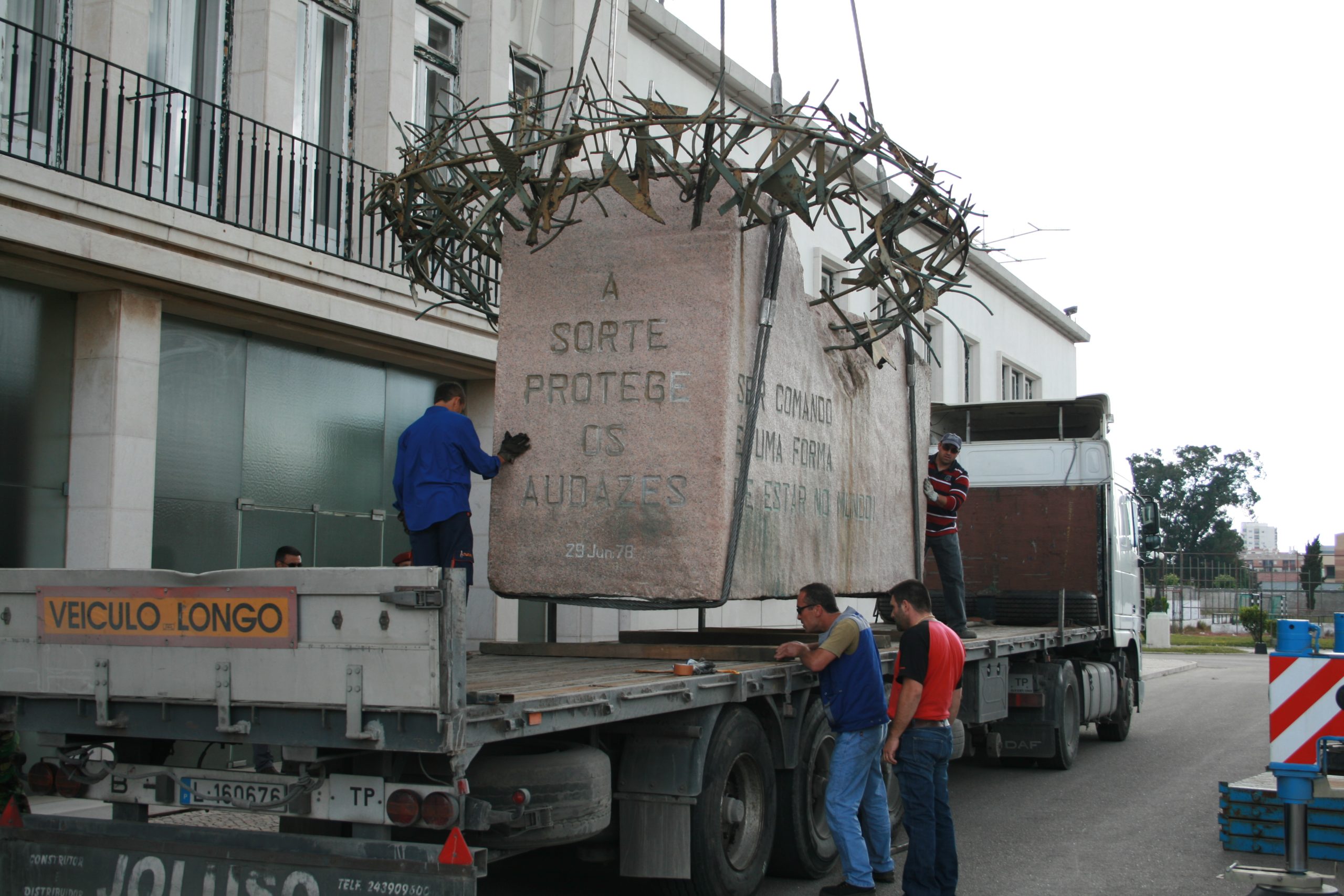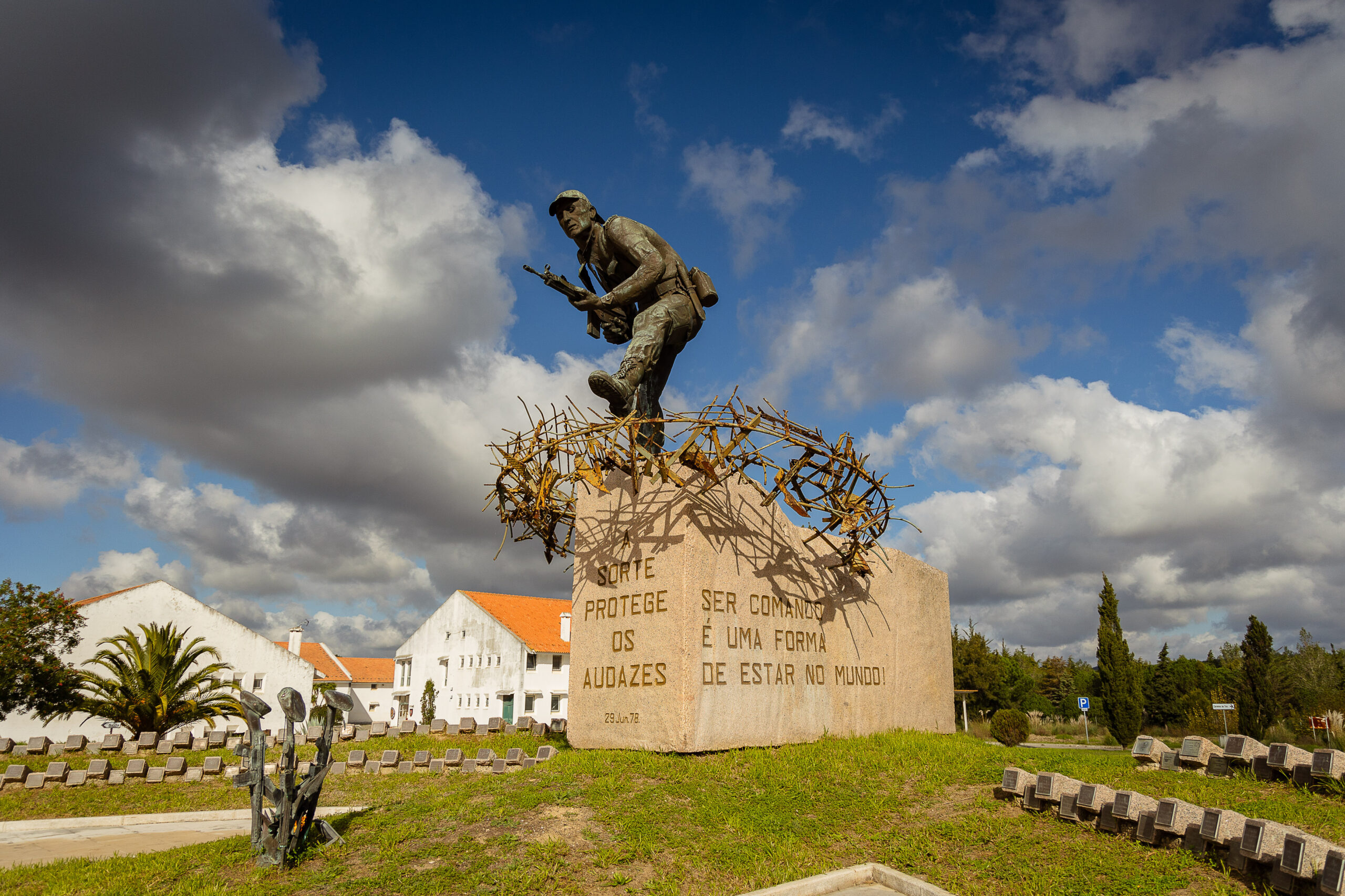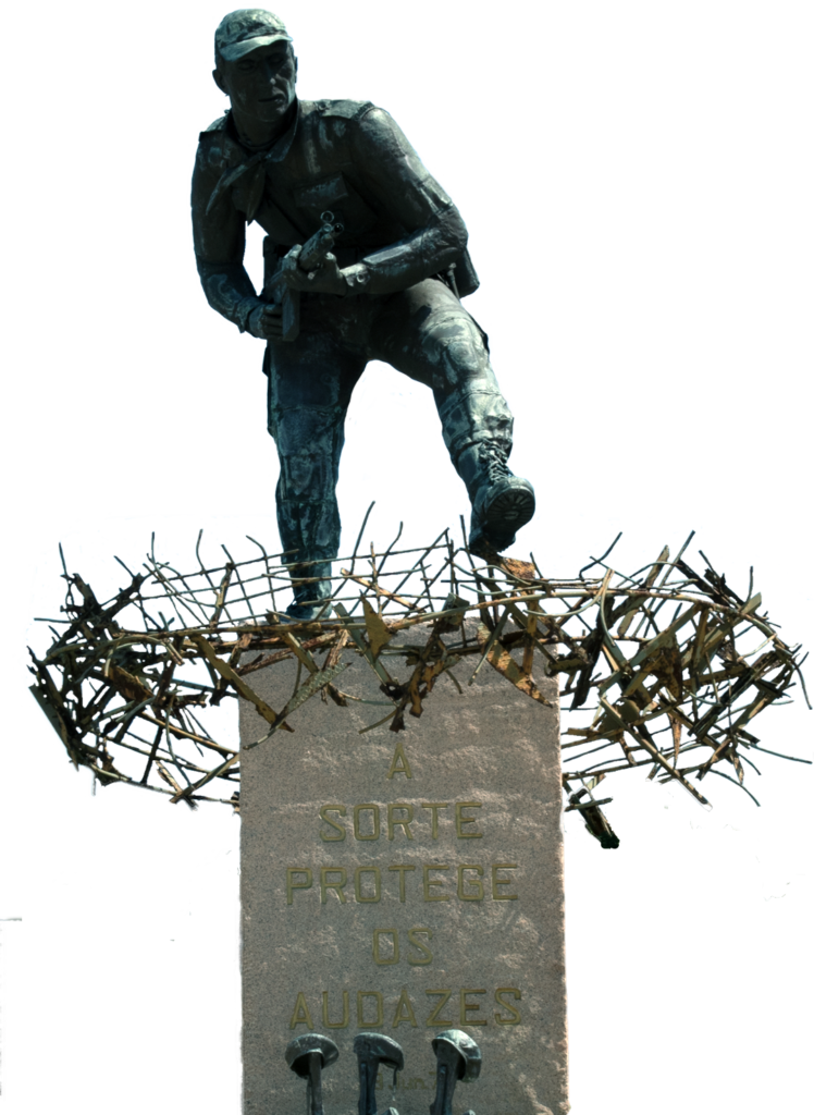 MONUMENTO AO ESFORÇO COMANDO MONUMENTO AO ESFORÇO COMANDO, um projecto que surgiu entre um encontro do Mestre Escultor Soares Branco e na altura Major Inf “Cmd” Jaime Neves, uma simbólica homenagem aos mortos na Guerra do Ultramar, eternizada num Comando de cobre martelado, em progressão cautelosa, procurando prudentemente o chão para o próximo passo, rodeado de perigos furtivos e dos nomes dos seus camaradas caídos em combate. Neste momento, o Mestre, pesaroso, lembra que, durante a execução da obra, mais alguns nomes foram acrescentados aos tantos que ali eram evocados, tombados nas terras distantes do Continente Africano. Inaugurado em 29 de Junho de 1978, no antigo Regimento de Comandos da Amadora, na Amadora. O Monumento foi transferido para o Centro de Tropas Comandos, na Carregueira. Sobre a trasladação da obra, em 31 de Maio de 2008, o Escultor maravilhou-se com o milagre da operação, de onde não resultou a mais pequena beliscadura nem acidente, considerando as suas portentosas dimensões. Número de placas que ladeiam o monumento: 406 |